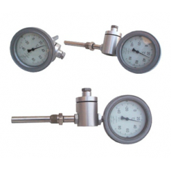 雙金屬遠傳溫度計(雙金屬指示熱電阻 ( 偶 ))是具有現場指示和遠傳顯示功能的一體化溫度測量儀表,可用來直接測量氣體、液體和物質的溫度。儀表可現場清晰地看到指示值,又可把信號遠傳到控制室。傳到控制室的信號有 Pt100 熱電阻信號,K、 E 型和 J 型熱電偶信號,也有經過變送為 4-20mA 的標準信號,起到了一表兩用的作用。